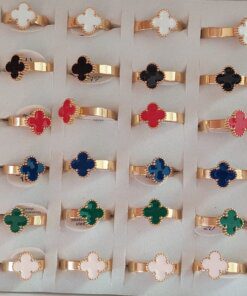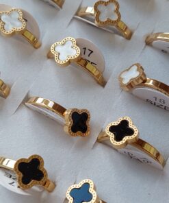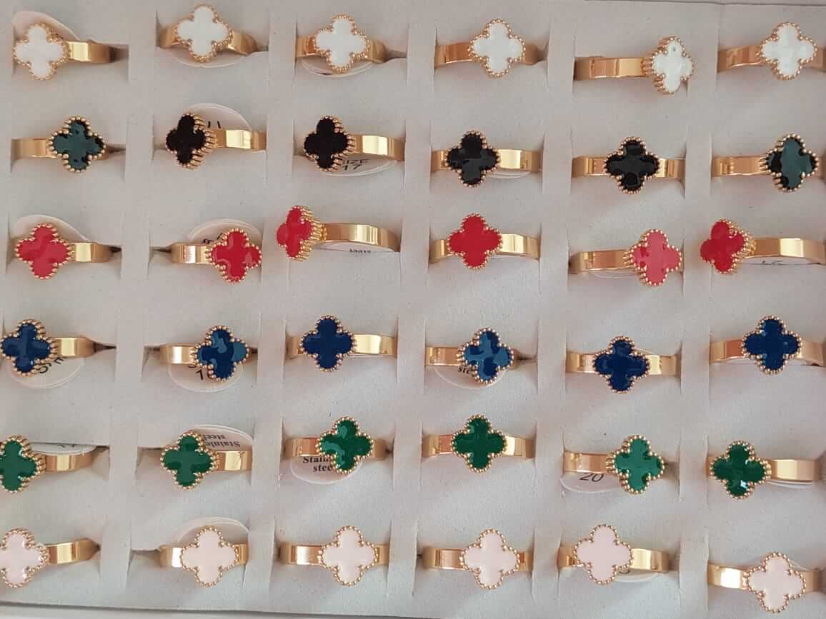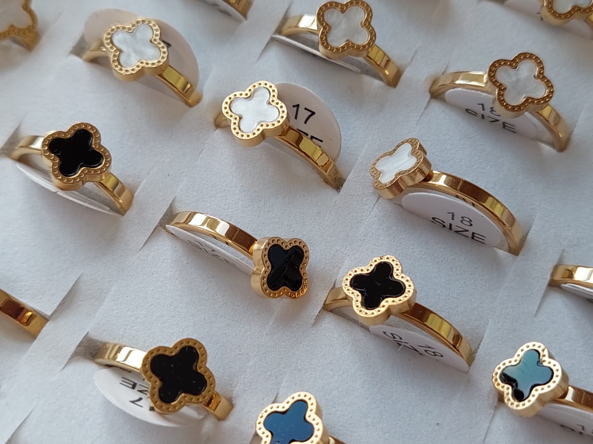 ANILLOS DE ACERO DORADO VAN CLEEF ESMALTADO X 36 UNIDADES. (MEDIDAS DEL 16 AL 19)