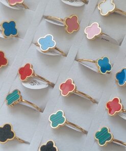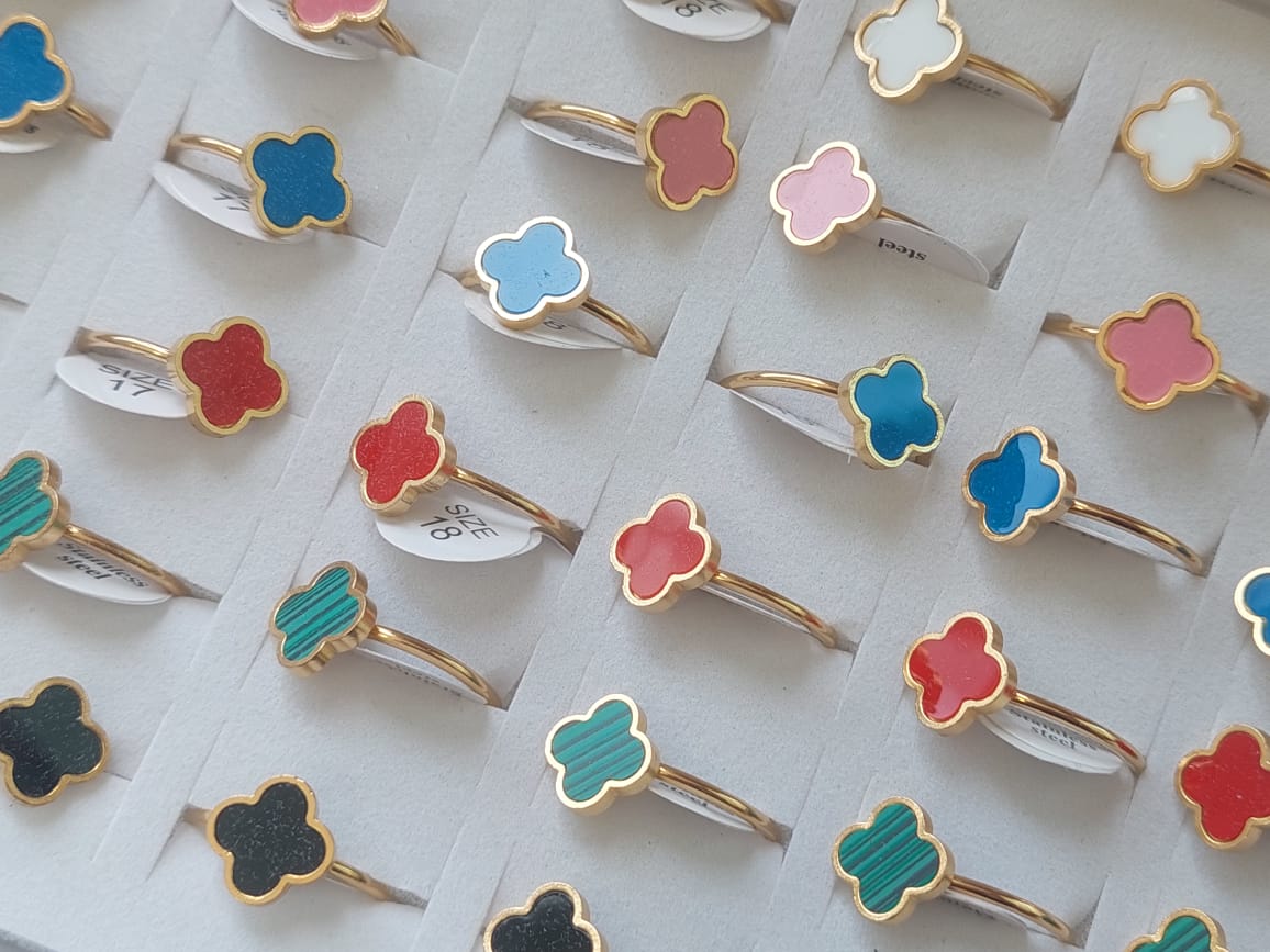 ANILLOS DE ACERO DORADO VAN CLEEF ESMALTADO X 36 UNIDADES. (MEDIDAS DEL 16 AL 20)
