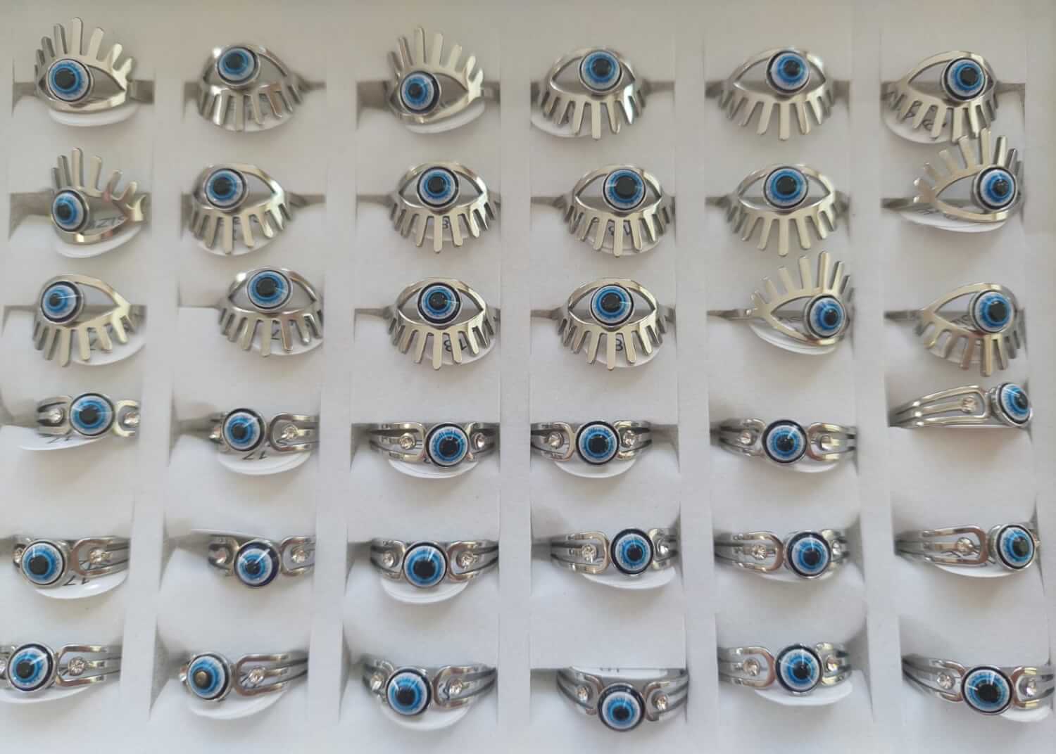 ANILLOS DE ACERO OJO TURCO AZUL (DOS MODELOS DIFERENTES) X 36 UNIDADES SURTIDOS EN MEDIDAS. (MEDIDAS DEL 17 AL 19)