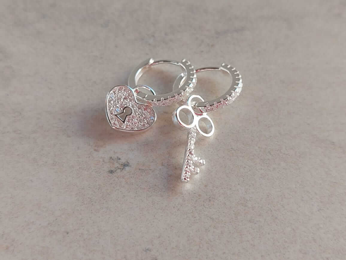 ARO PLATA HUGGIES 15 MM CON ZIRCONES Y DIJES CORAZÓN/LLAVE C/ZIRCONES. PESO APROX 4.00 GRS.
