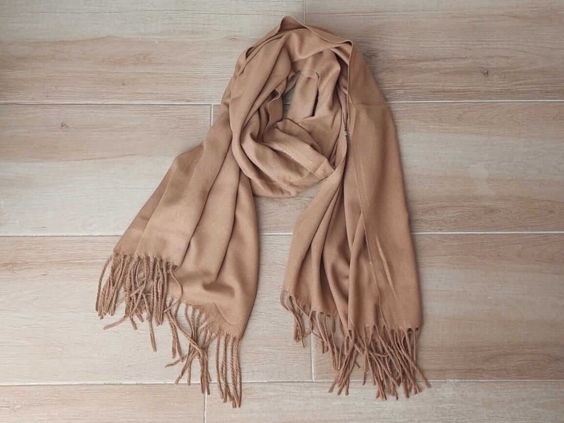 BUFANDA DE PAÑO LISA CAMEL CON FLECOS. MEDIDA APROXIMADA 70 X 180 CM