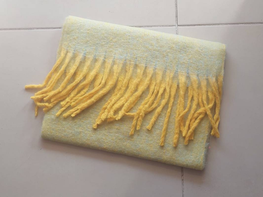 BUFANDÓN JASPEADO VERDE CLARO CON FLECOS AMARILLOS . 50 X 190 CM
