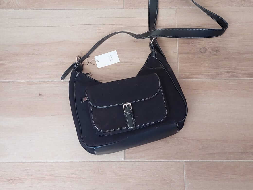 CARTERA SÍMIL GAMUZA COLOR NEGRA CON BOLSILLO FRONTAL CON HEBILLA. TAMAÑO 24 CM X 30 CM