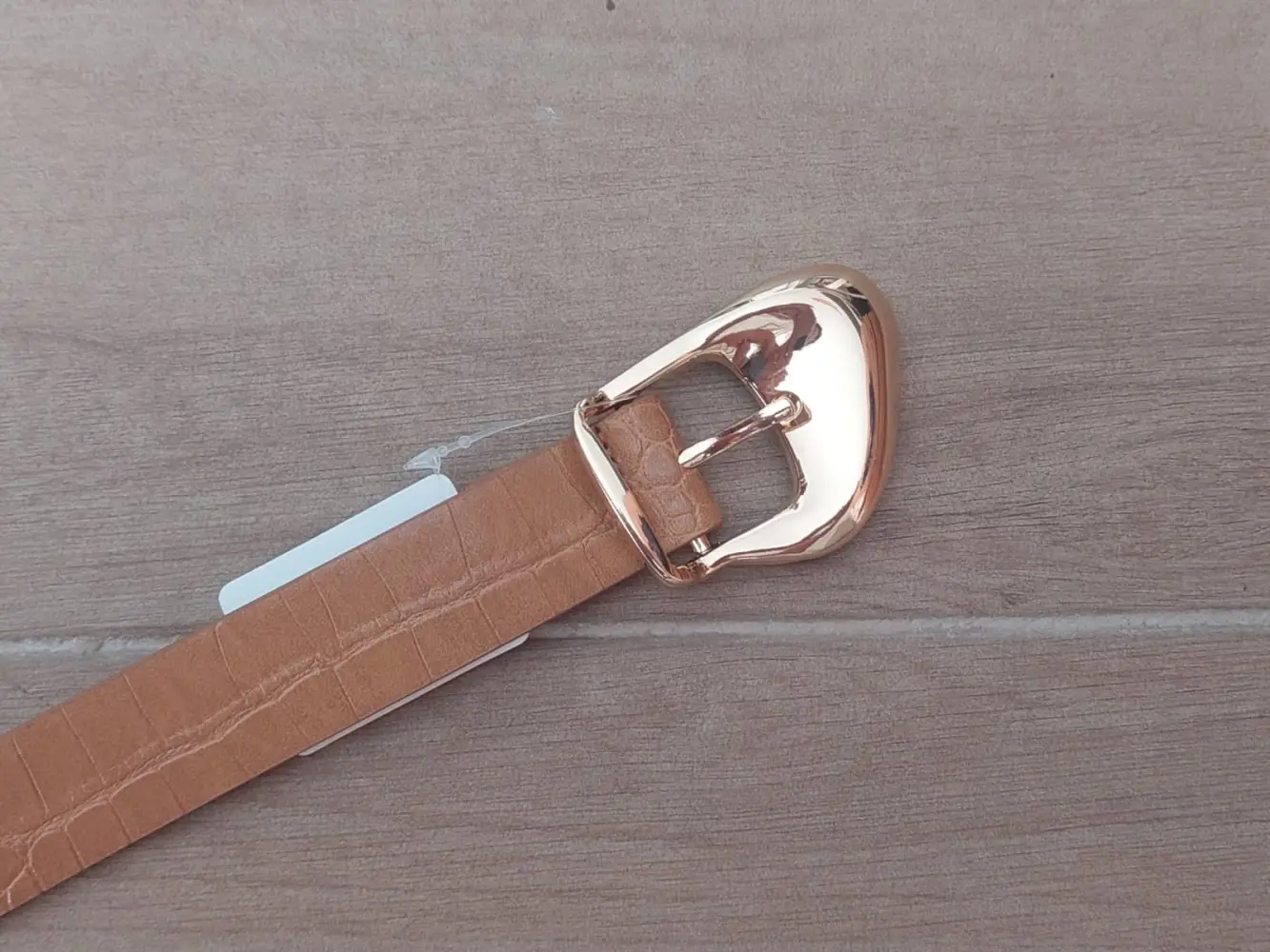CINTO DAMA SÍMIL REPTIL COLOR CAMEL CON HEBILLA DORADA IRREGULAR