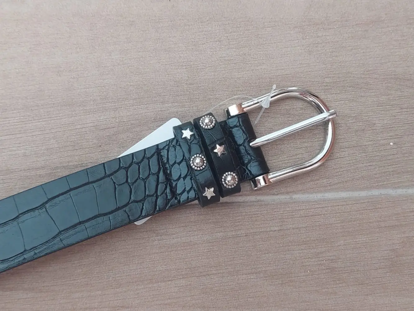 CINTO DAMA SÍMIL REPTIL COLOR NEGRO CON HEBILLA PLATEADA Y TACHAS CON ESTRELLAS