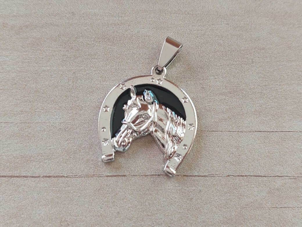 DIJE DE ACERO HERRADURA Y CABALLO CON FONDO ESMALTADO EN NEGRO. MEDIDAS 24 X 24 MM