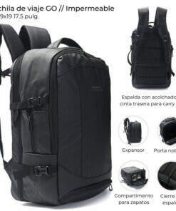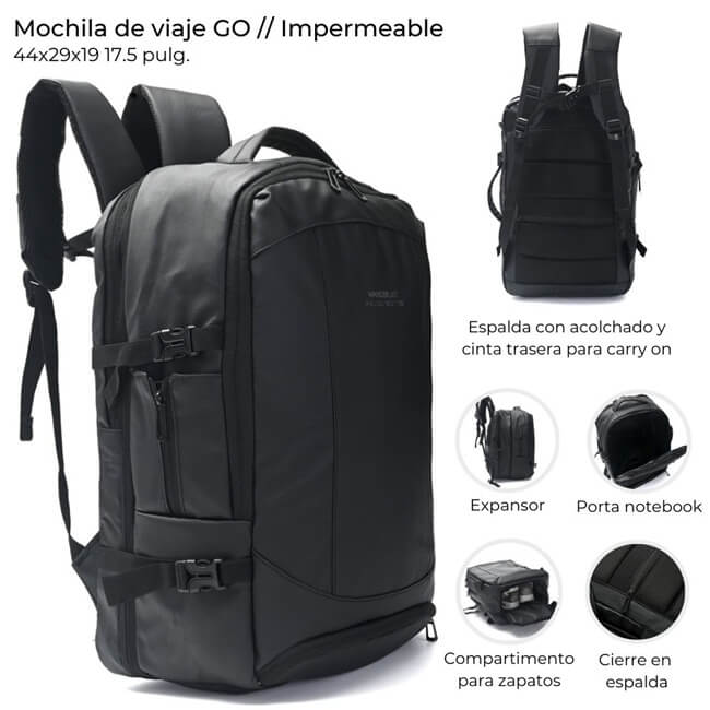 Mochila de viaje Go dos compartimentos principales. Expansor. Compartimento para zapatos. Bolsillo frontale. Portanotebook. Cinta para trolley. 44x29x19 17.5 pulg. Tela impermeable x 1u