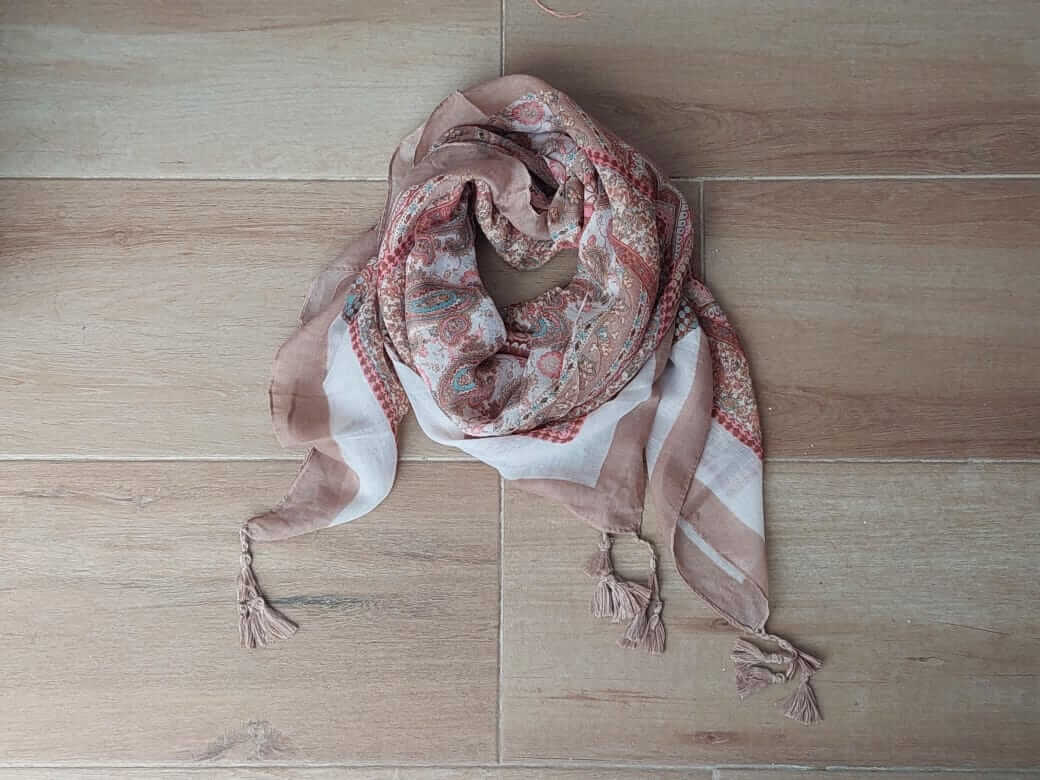 PAÑUELO DE VISCOSA ESTAMPADO FONDO BEIGE CON ARABESCOS Y FLECOS TRENZADOS EN LAS PUNTAS 1,1 M X 1,1 M