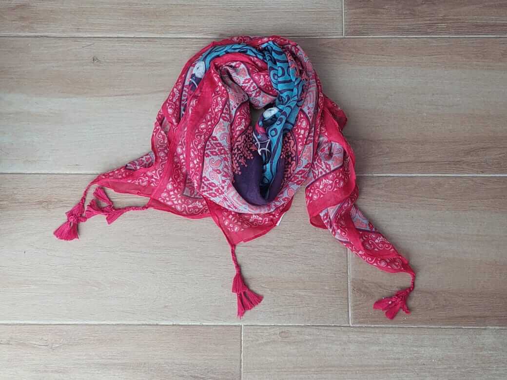 PAÑUELO DE VISCOSA ESTAMPADO FONDO ROJO CON MANDALA Y GUARDA PIXELADA, FLECOS TRENZADOS EN LAS PUNTAS 1,1 M X 1,1 M