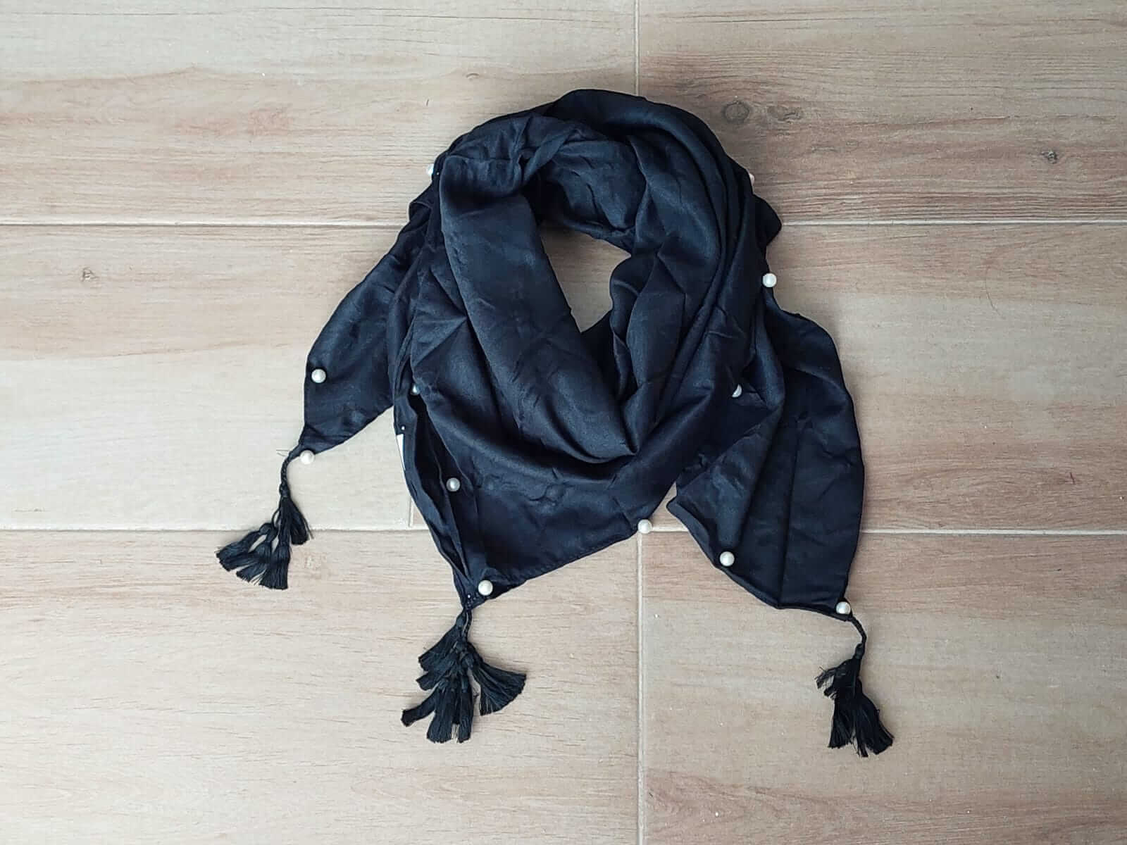 PAÑUELO DE VISCOSA LISO NEGRO CON PERLAS 10 MM EN BORDES Y FLECOS TRENZADOS EN LAS PUNTAS 1,1 M X 1,1 M