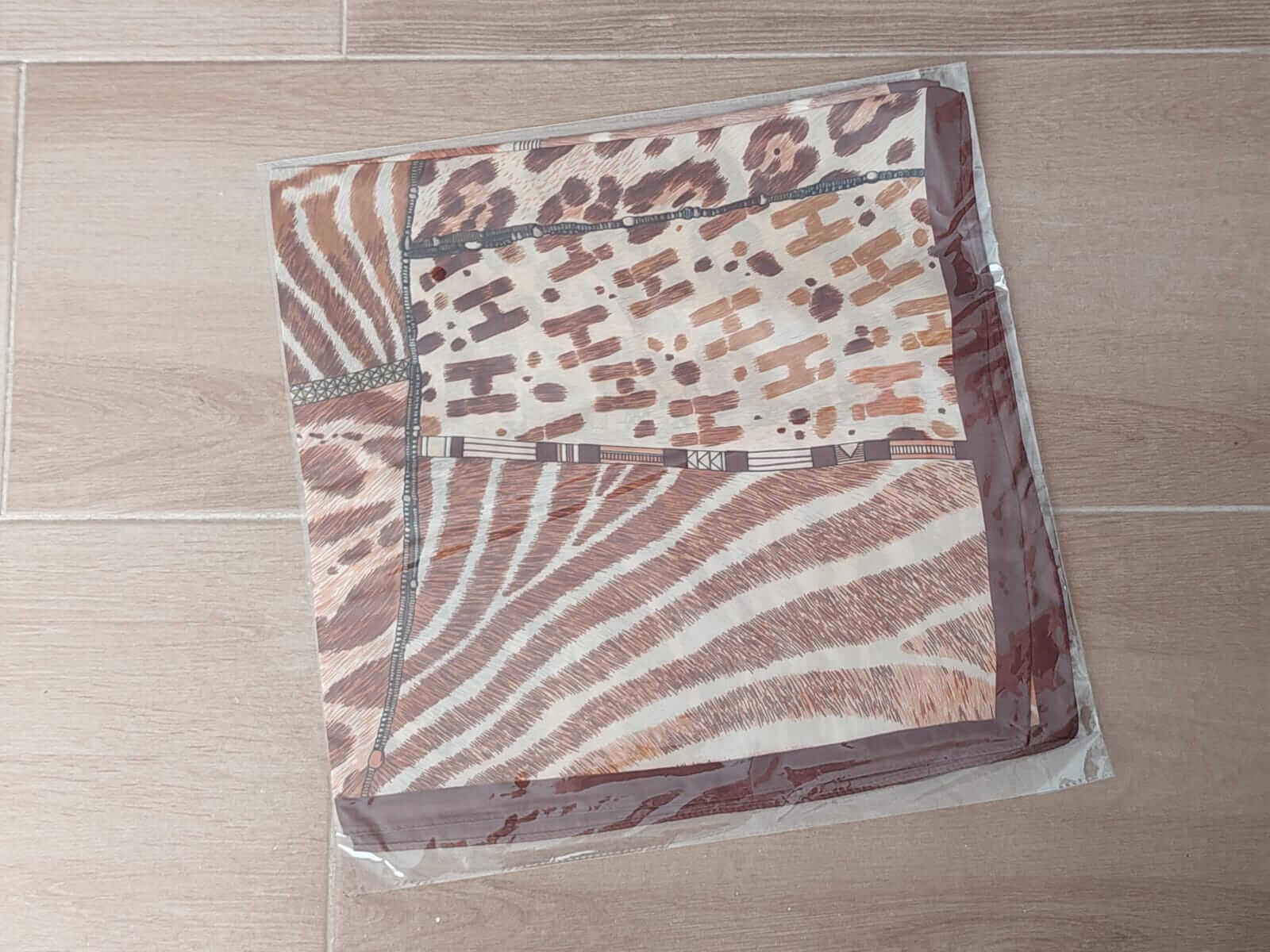 PAÑUELO RASADO ESTAMPADO ANIMAL PRINT COLOR TIERRA. TAMAÑO 70 X 70