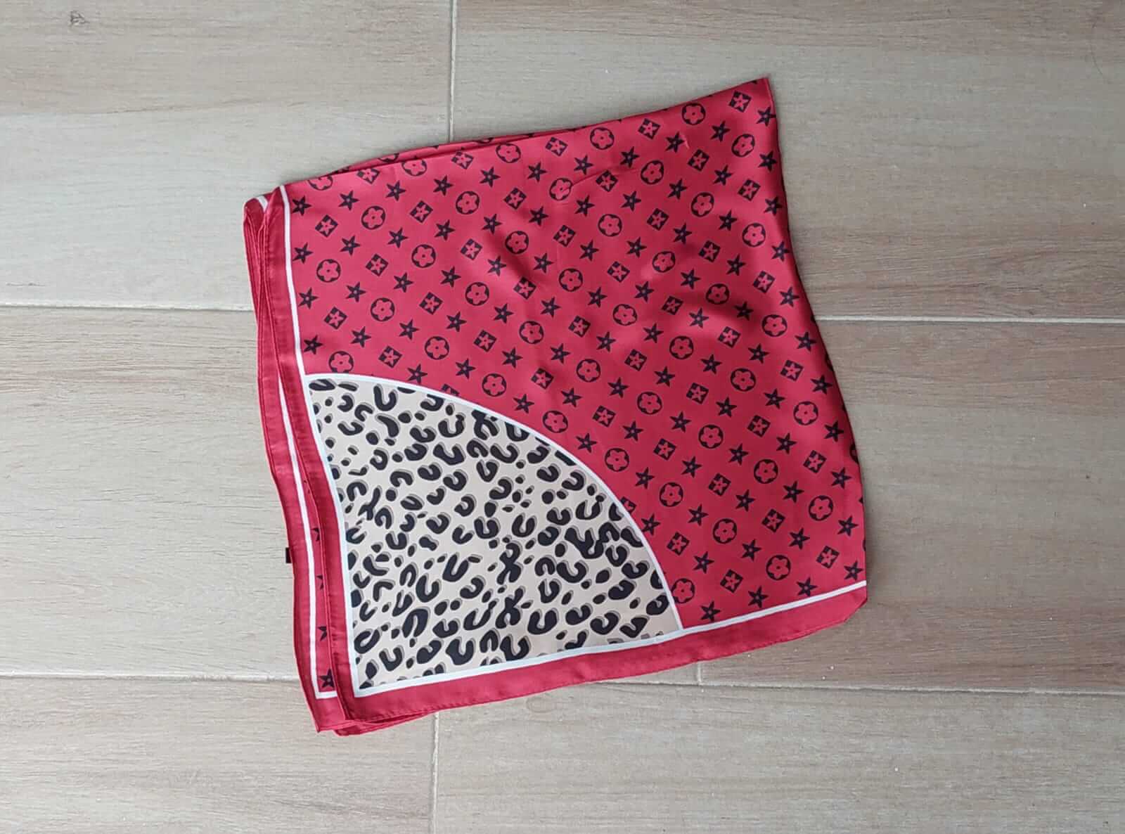 PAÑUELO RASADO ESTAMPADO FONDO ROJO CON DIBUJOS NEGROS Y PUNTAS ANIMAL PRINT. TAMAÑO 70 X 70