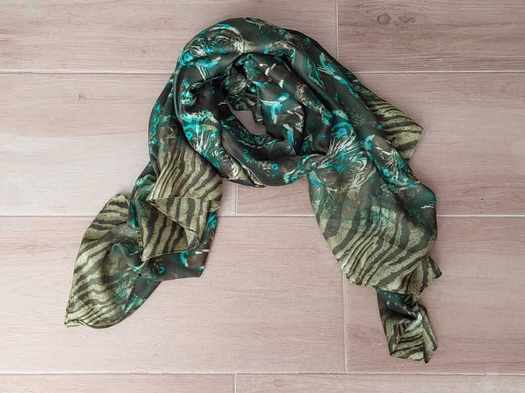 PASHMINA ESTAMPADA ANIMAL PRINT TONALIDADES VERDE 90 X 180 CM.