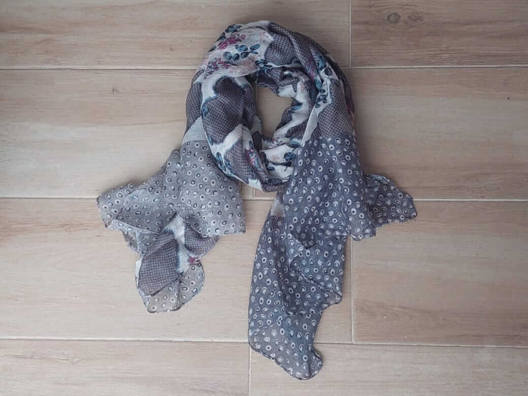 PASHMINA ESTAMPADA CON FLORES Y DETALLES GRISES AZULADOS, 90 X 180 CM.