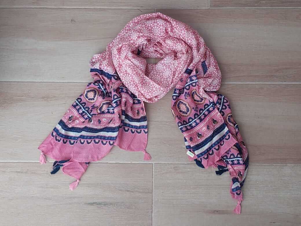 PASHMINA LINEA PREMIUM TRAMADA CON BORLAS, BASE ROSA CON FLORES Y GUARDAS FINALES. 90 X 190 CM.