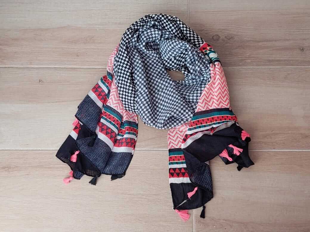 PASHMINA LINEA PREMIUM TRAMADA CON BORLAS, CENTRO DAMERO BLANCO Y NEGRO Y GUARDAS FINALES ESTAMPADAS, COLOR BASE NEGRO. 90 X 190 CM.