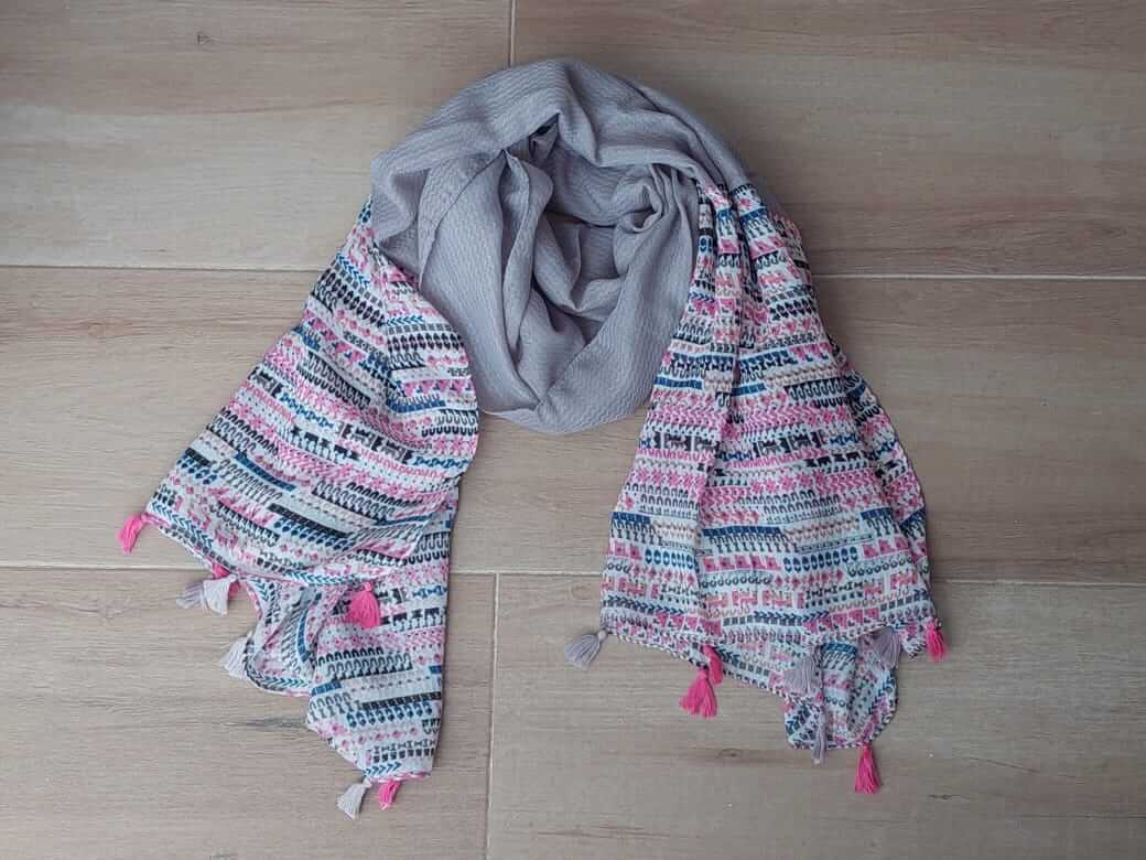 PASHMINA LINEA PREMIUM TRAMADA CON BORLAS, CENTRO LISO Y GUARDAS FINALES ESTAMPADAS, COLOR BASE GRIS. 90 X 190 CM.