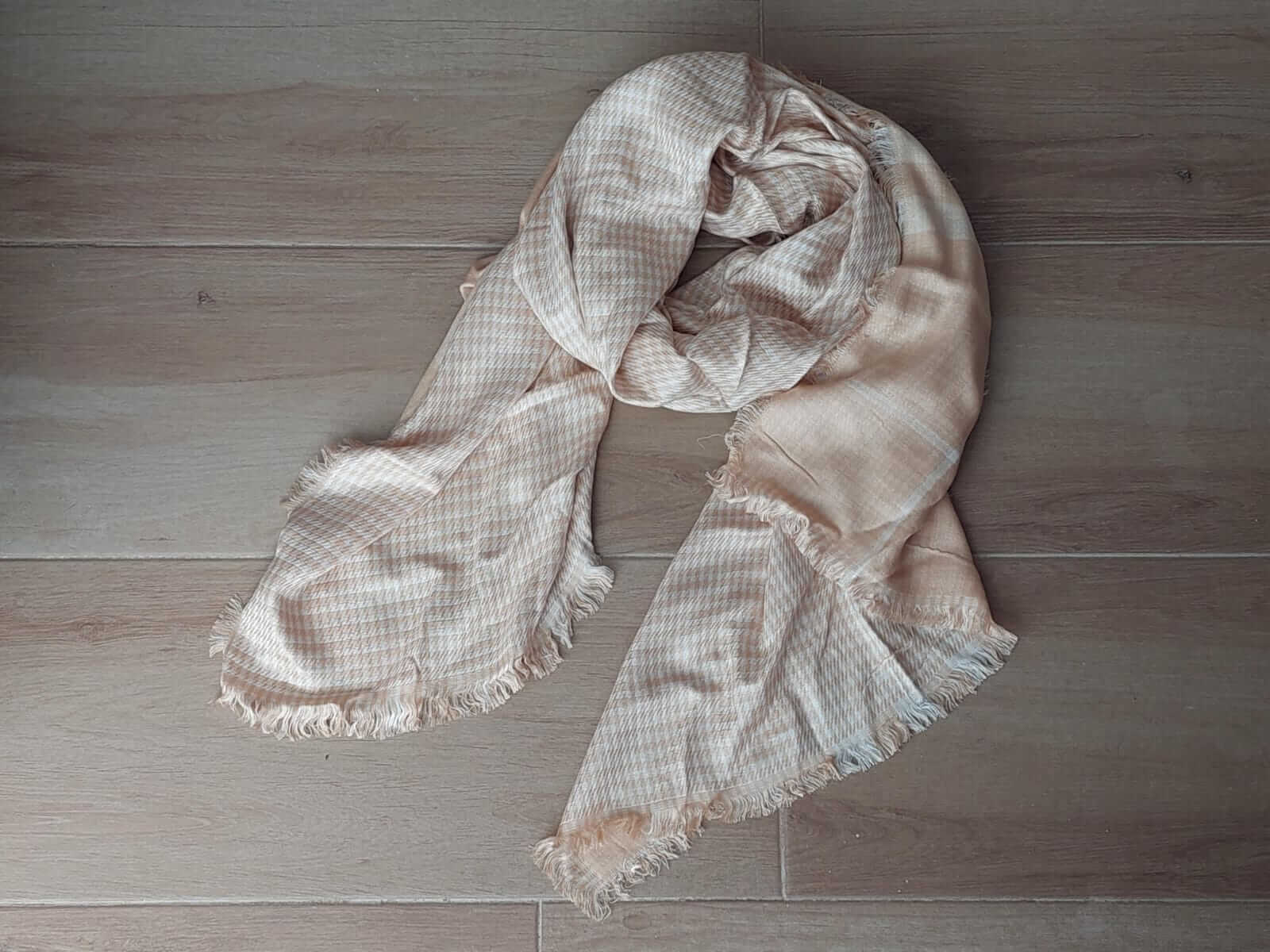PASHMINA PREMIUM DESFLECADA REVERSIBLE, TONOS BEIGE. TAMAÑO 70 X 180 CM.