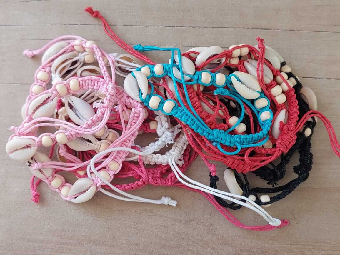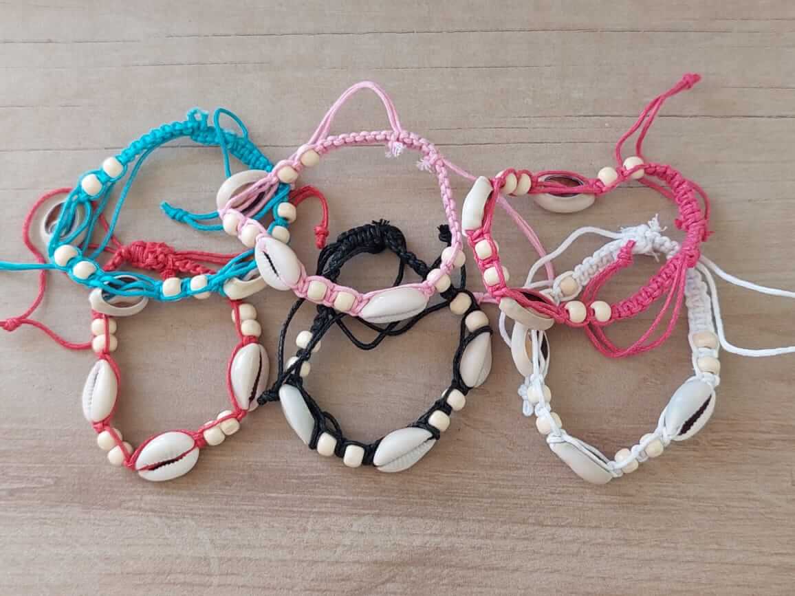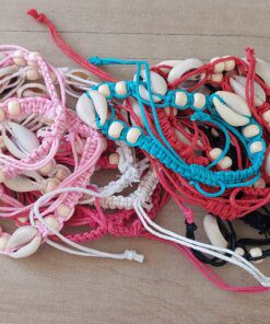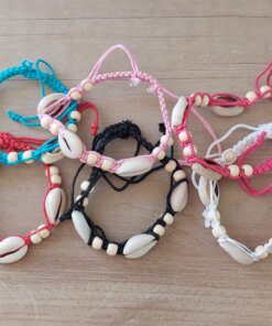 PULSERA HILO AJUSTABLE COLORES SURTIDOS CON CARACOLES Y SEMILLAS ENHEBRADAS. PACK X 12 UNIDADES SURTIDAS.