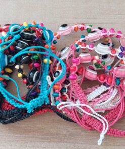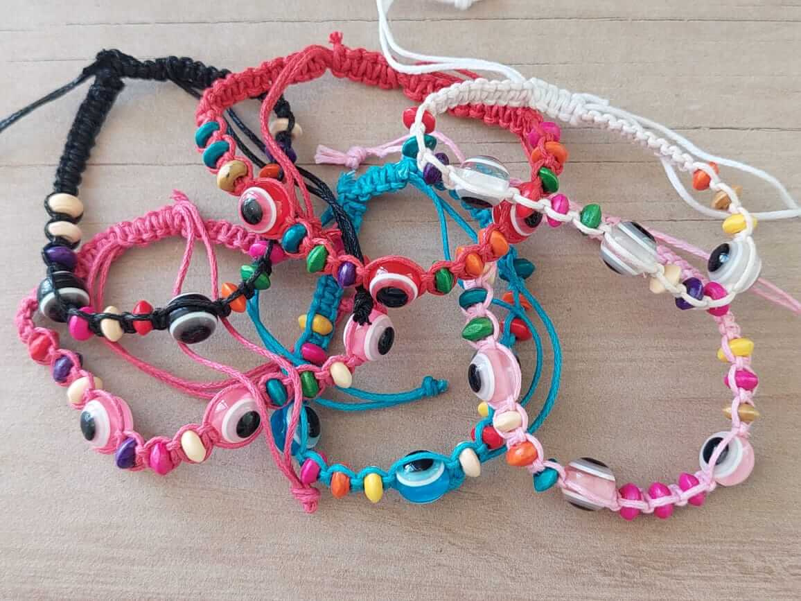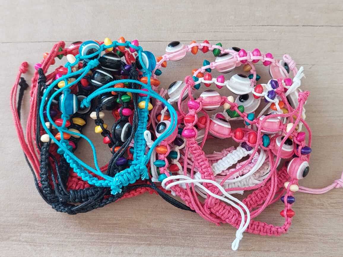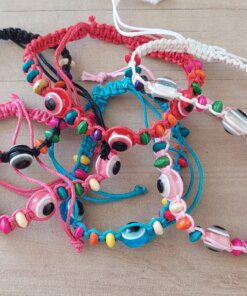 PULSERA HILO AJUSTABLE COLORES SURTIDOS CON OJO TURCO Y SEMILLAS ENHEBRADOS. PACK X 12 UNIDADES SURTIDAS.