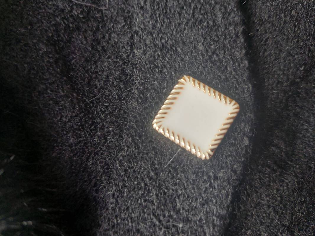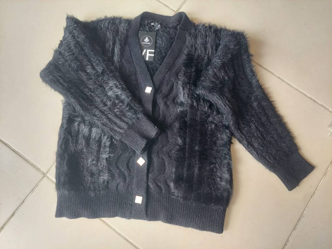 SWEATER CARDIGAN SÍMIL PIEL COLOR NEGRO CON BOTÓN CUADRADO DORADO Y ESMALTADO EN BLANCO. TALLE ÚNICO